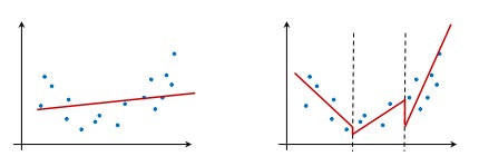 Alternatively, the data can be analyzed using a set of regression models, each using its own part of the data. Regression models and regression trees are illustrated in the following diagram. Regression models construct one model that fits all the data best. However, regression trees construct a set of regression models, each modeling a part of the data, as shown on the right. Regression trees can better fit data than regression models, but the function is piece-wise linear, with jumps between modeled regions, as shown below: