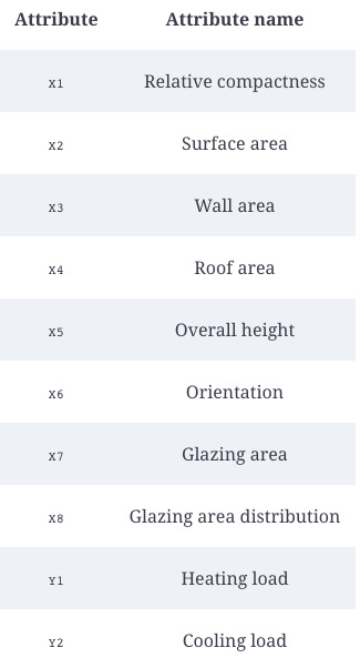 The first thing we should do is understand what we are dealing with before analyzing the attributes. As shown in the following table, there are eight attributes that describe the building characteristics, as well as two target variables: