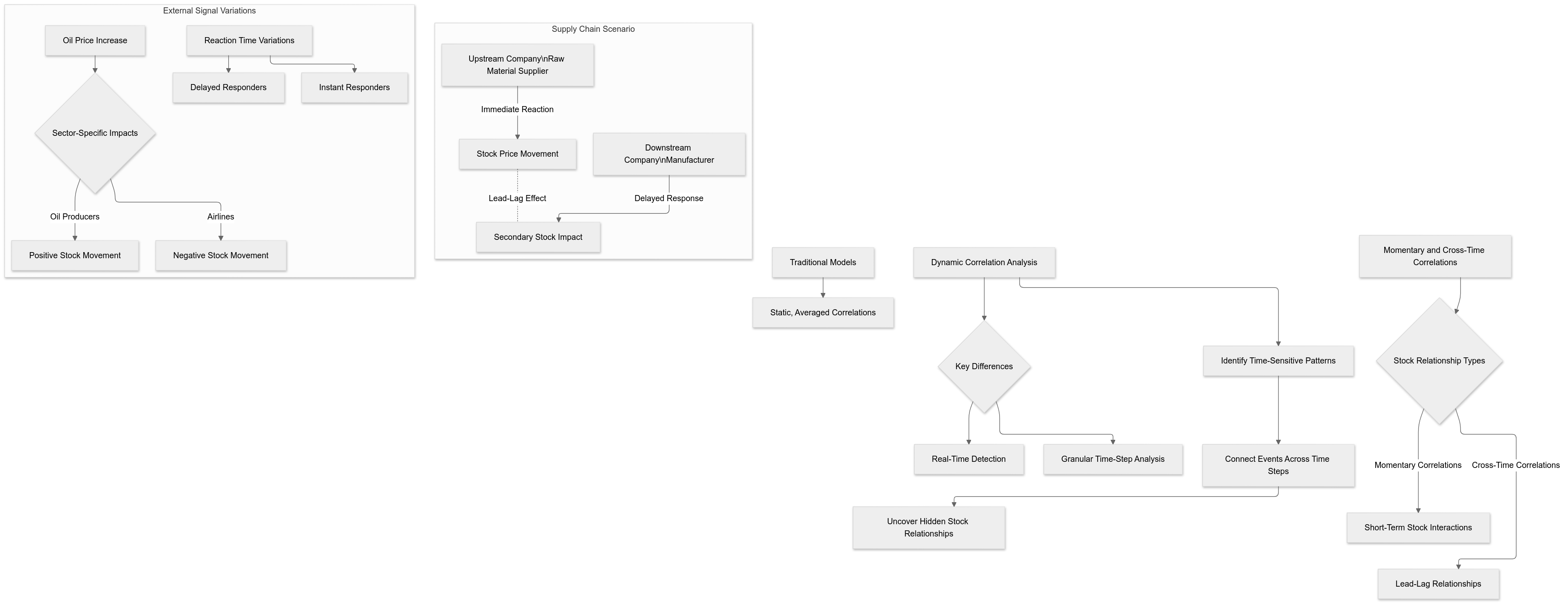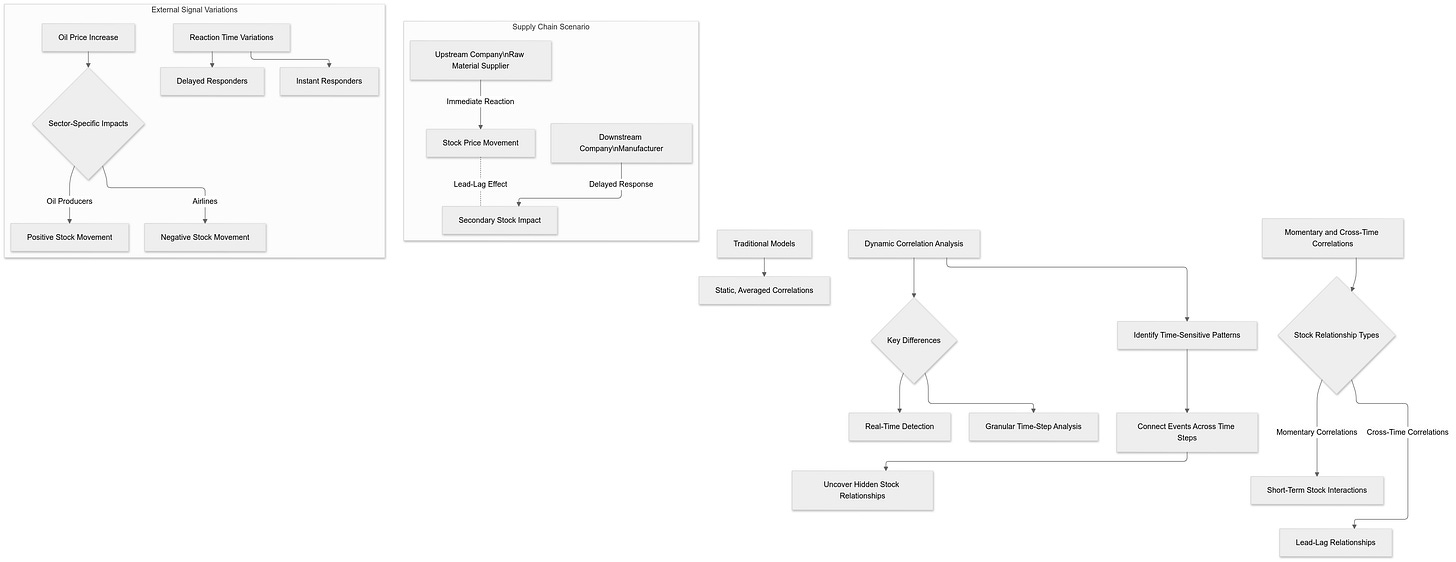 In a real-world stock market, relationships between stocks are rarely static or consistent. Traditional models assume that if two stocks are related, they will behave similarly across the entire historical period. However, this is far from true. Stock correlations are often momentary, occurring for short periods, and may also be cross-time, meaning one stock’s behavior influences another at a later time.