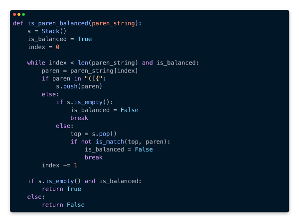 Upon exiting the while loop, on line 21, we check if the stack is empty, and determine if it is balanced by checking if is_balanced is True, at this point we return True. We return False if the condition is not met.