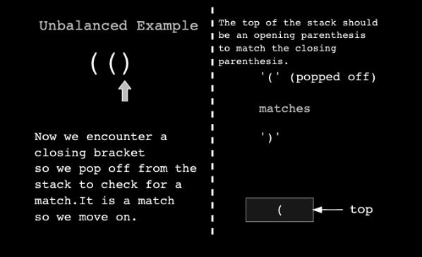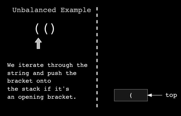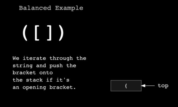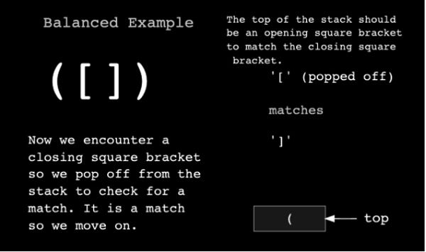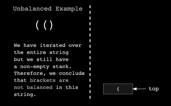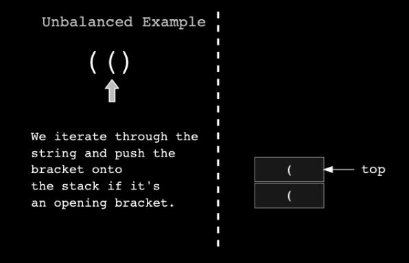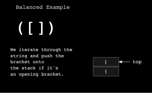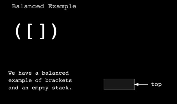 If the brackets are balanced, the stack will be empty at the end of the iteration. If they are unbalanced, we will still have some elements in the stack.