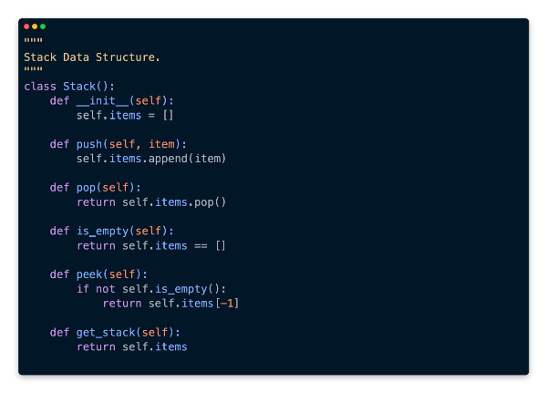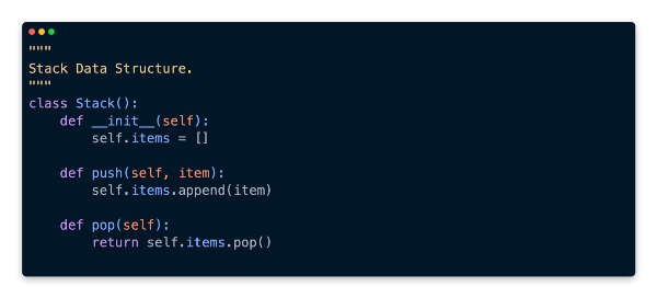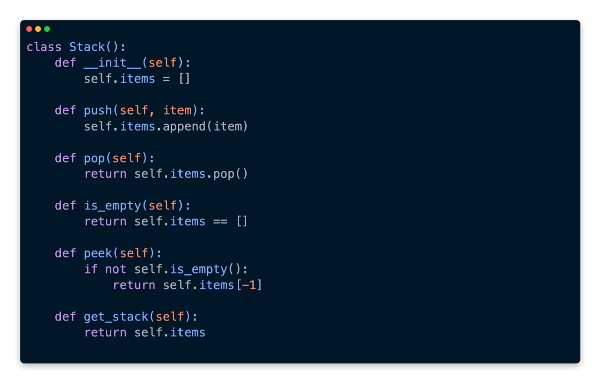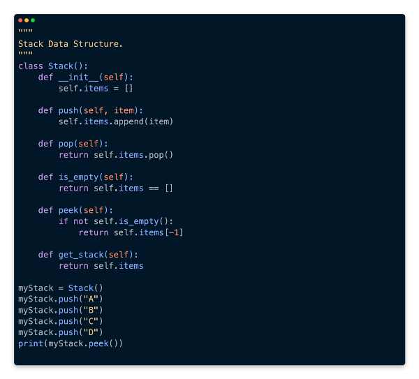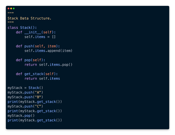 The second method that needs to be implemented is pop. Python makes this very easy as well, since we’re based on a list. The last element inserted into the list is returned by the pop method implicitly.