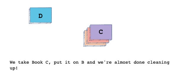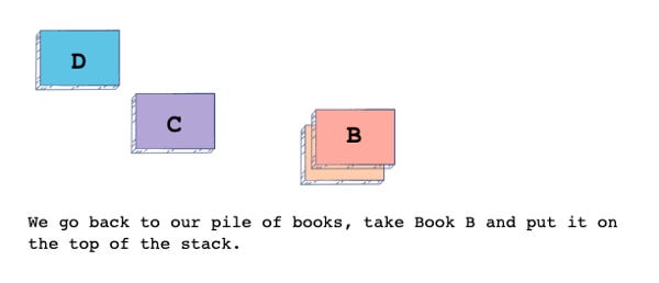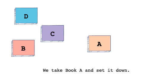 For instance, let’s say we want to take Book A out of the stack. As it stands, it is at the bottom of the stack, so we need to take Book D, put it on the bottom of the stack, and then we need to do the same for Book C and Book B before we can take out Book A.