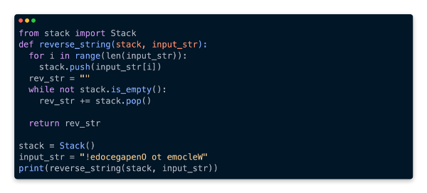 In the code above, there is a reverse_string function that we will discuss in more detail. In the for loop on line 3, each character in input_str is iterated over and pushed onto the stack through the for loop. As a result, we create rev_str to be an empty string, and then we initialize it. Upon removing all the elements from the stack, we append them to rev_str and wait until it becomes empty, at which point the while loop is terminated, and all the elements are appended to rev_str one by one. On line 9, we are returning the rev_str back to the caller.