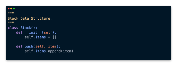 Appending an item to a Python list is done using the append method. This is exactly what we want to do in the push method for our stack.