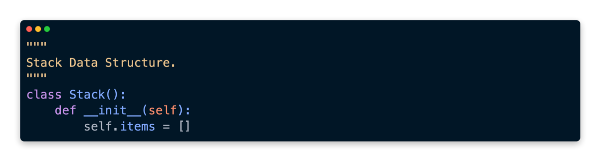 This is an empty list that I’m assigning to a class variable called items. Now let’s create the push method using self.items, which is created when we create a stack object: