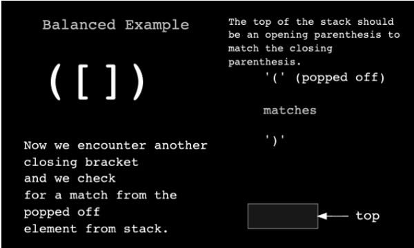 If we come across a closing bracket in the stack, we need to pop off an element from the stack and find an element that matches the closing bracket. We conclude it is a successful match if it is an opening bracket, and if it is also of the same type as the closing bracket, then we move on to the next step. As a result, if it’s not, we will conclude that there is not an equal number of brackets in the set.