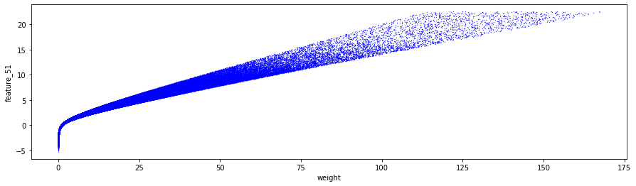 Subsequently, the scatter plot is generated by plotting points where the x-coordinates represent the values of weight and the y-coordinates correspond to the values of feature_51 within the train_data_nonZero dataset. Each point is sized at 0.1, resulting in relatively small dots that are colored blue.