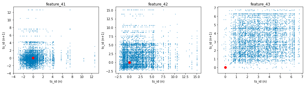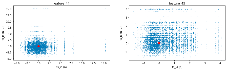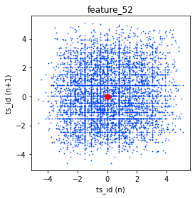 Additionally, the plot is titled feature_52 to clarify the data being represented. The labels for the x and y axes are designated as ts_id (n) and ts_id (n+1), respectively, enhancing the understanding of what each axis signifies. Finally, a red dot is positioned at the origin (0, 0), sized appropriately to serve as a reference point within the visualization.
