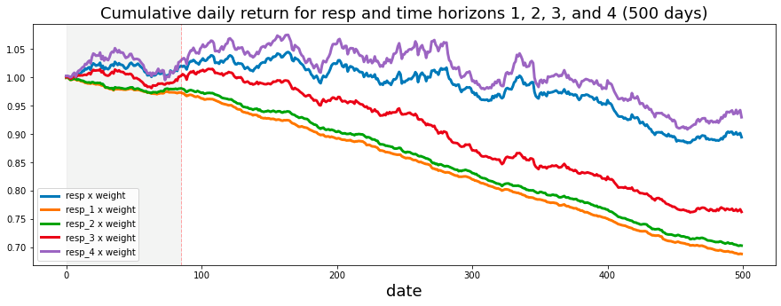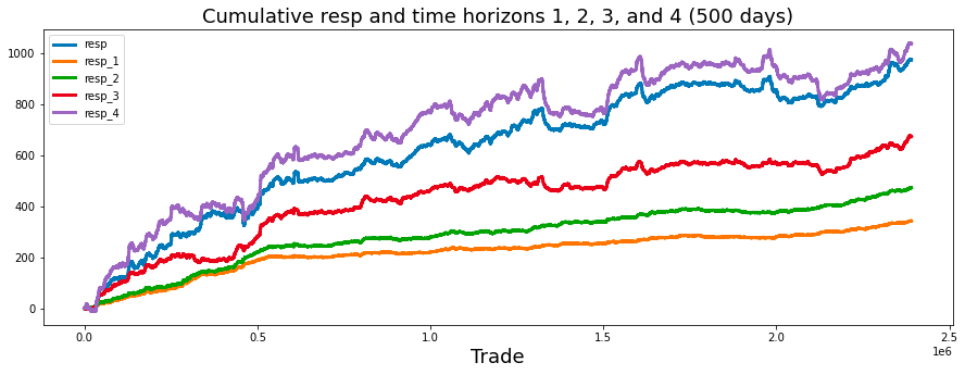 The dataset consists of a total of 500 days of data, equivalent to two years of trading information. We will now examine the cumulative values of the variable resp over this period.