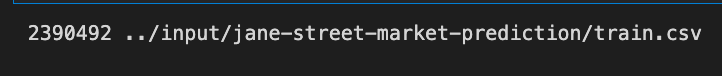 In this instance, the file being analyzed is “train.csv,” which is located in the directory “../input/jane-street-market-prediction/.” The presence of the double dots (“..”) at the start of the path signifies that the command is referencing a parent directory located one level above the current working directory.