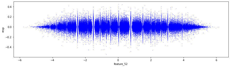 Subsequently, the code employs the scatter function to depict individual data points on the axes. Each point corresponds to a pair of values derived from feature_52 and resp. The points are represented with a very small marker size of 0.1 and are colored blue, which serves to enhance their visibility.