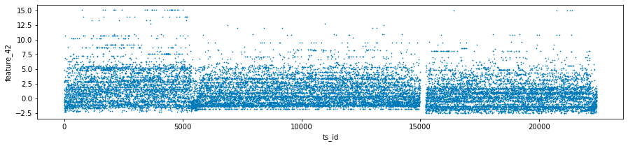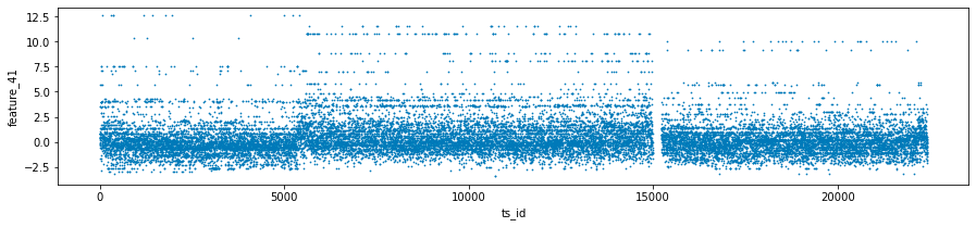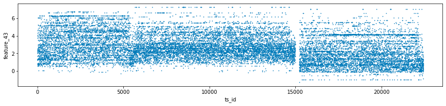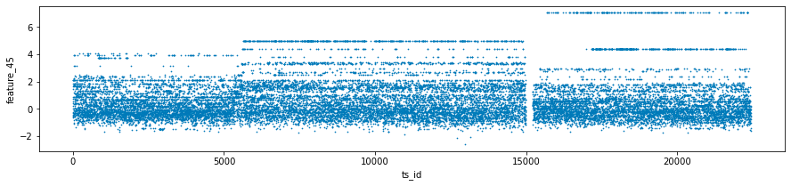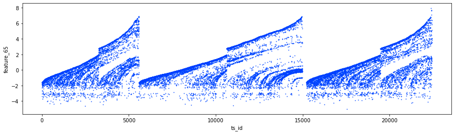 three_days.plot.scatter(x='ts_id', y='feature_65', s=0.5, figsize=(15,4));Specifically, it juxtaposes the variable ts_id with another variable, feature_65. The points on the scatter plot are given a very small size of 0.5, which minimizes the risk of excessive overlap, a consideration that is especially pertinent when handling large datasets. The dimensions of the figure are specified to be 15 units in width and 4 units in height to enhance visibility.
