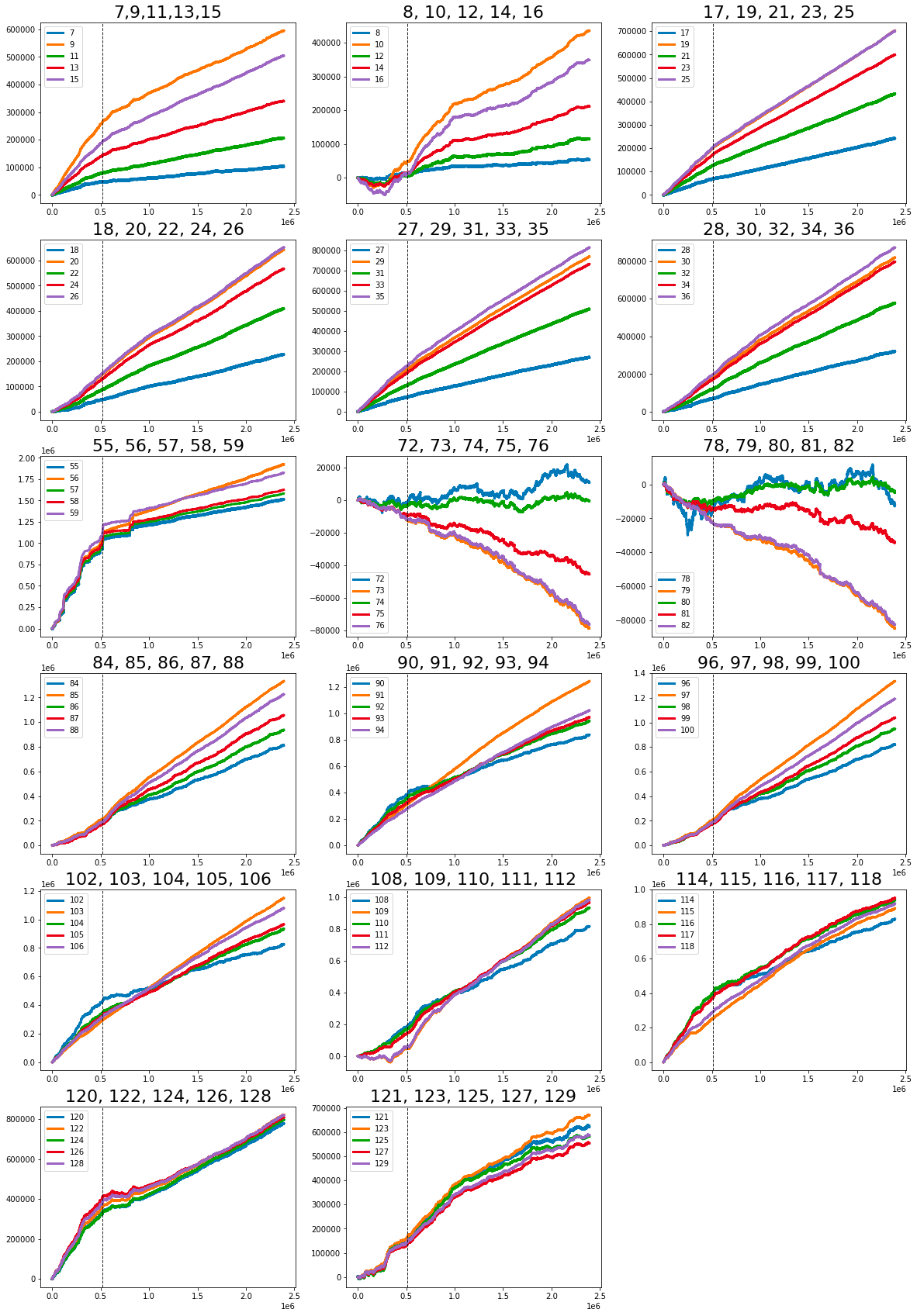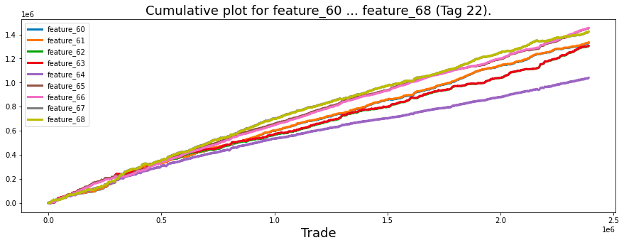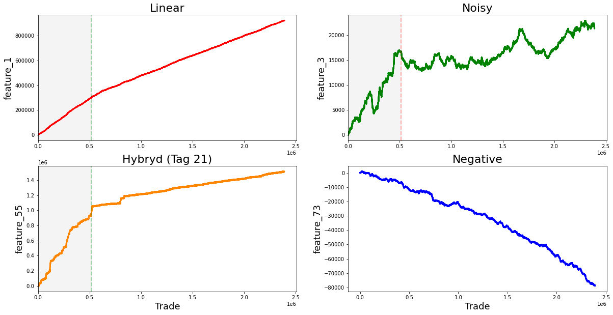 In contrast, the features classified as Hybrid, specifically those in Tag 21, encompass numbers 55, 56, 57, 58, and 59. Initially, these features exhibit noise, displaying prominent, almost discontinuous steps at the trade marks of 0.2M, 0.5M, and 0.8M. Subsequently, they transition to a linear pattern. Collectively, these five features constitute the Tag 21 set.
