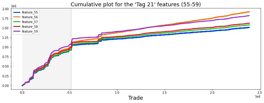 ax.set_title ("Cumulative plot for the 'Tag 21' features (55-59)", fontsize=18)