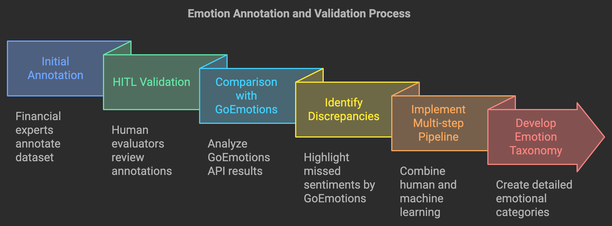 Ensuring the quality and reliability of the annotated dataset is paramount for the effectiveness of subsequent financial sentiment analysis and market prediction models. To validate the integrity and accuracy of our emotion annotations, we employed a rigorous Human-in-the-Loop (HITL) validation process, which involved a comparative analysis with existing emotion detection models and comprehensive strategies to maintain high-quality annotations throughout the dataset.