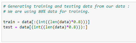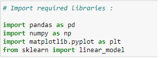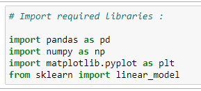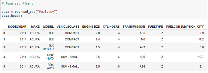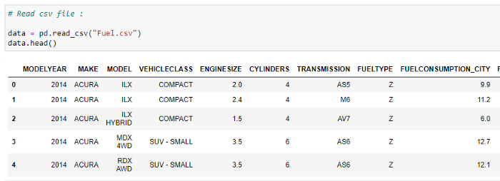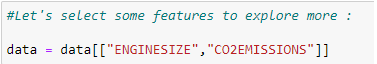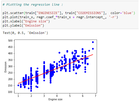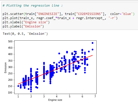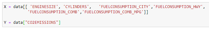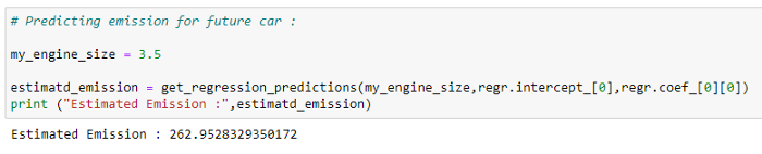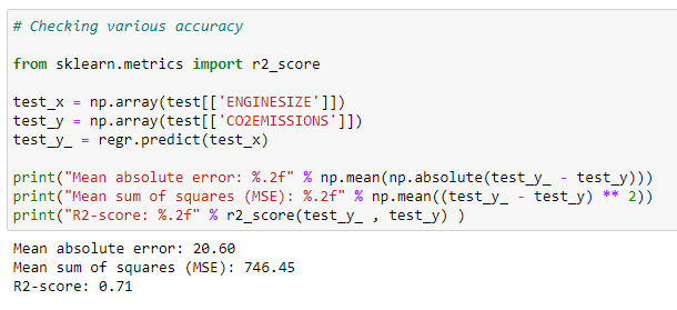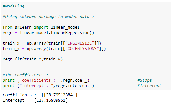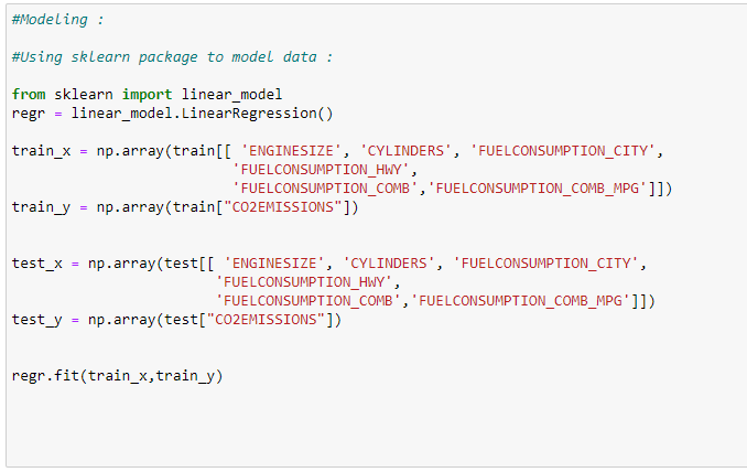 train_y = np.array(train[“CO2EMISSIONS”])regr.fit(train_x,train_y)test_x = np.array(test[[ ‘ENGINESIZE’, ‘CYLINDERS’, ‘FUELCONSUMPTION_CITY’,