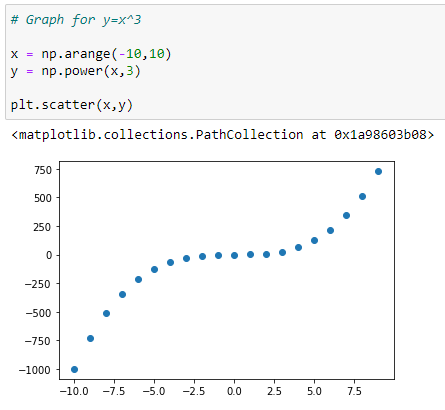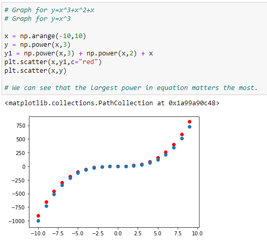 In the graph above, we can see that the red dots show the graph for Y=X³+X²+X and the blue dots shows the graph for Y = X³. Here we can see that the most prominent power influences the shape of our graph.