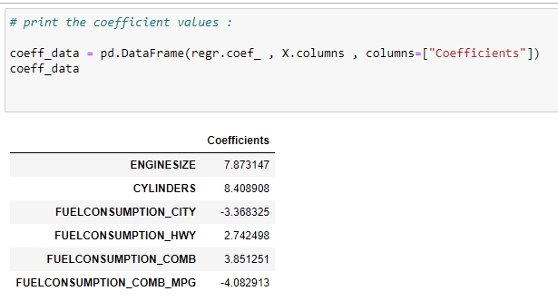 coeff_data = pd.DataFrame(regr.coef_ , X.columns , columns=[“Coefficients”])