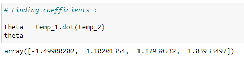 By multiplying temp1 and temp2, we can find the coefficient values. This is the formula for normal equations.