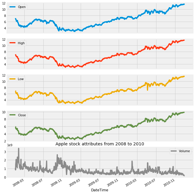 plt.show()This code snippet is intended to visualize specific stock attributes of Apple Inc. from the years 2008 to 2010. It utilizes a dataset, likely structured as a DataFrame that contains stock information, and filters the data to focus exclusively on the selected time frame. Subsequently, it generates separate subplots for each relevant attribute, such as opening price, closing price, and trading volume.
