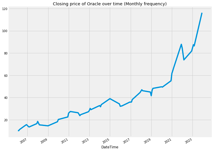plt.title('Closing price of Oracle over time (Monthly frequency)')