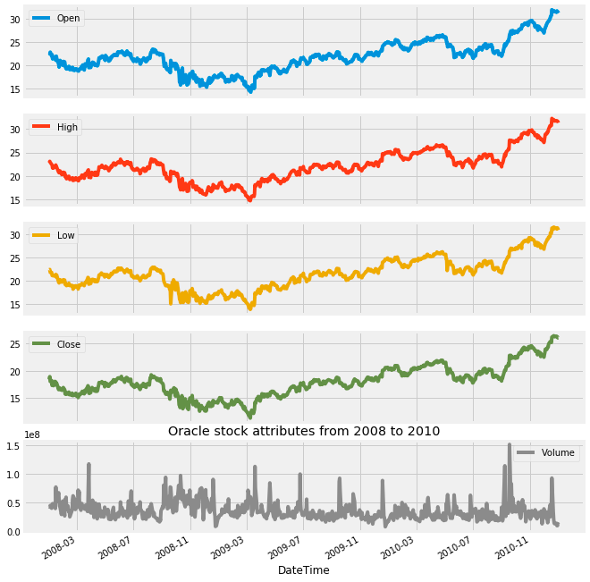 plt.show()The provided code generates a visual representation of Oracles stock attributes for the years 2008 to 2010. It utilizes a plotting library to create subplots, meaning that each attribute of the stock is featured in its own distinct graph within a unified visual framework.