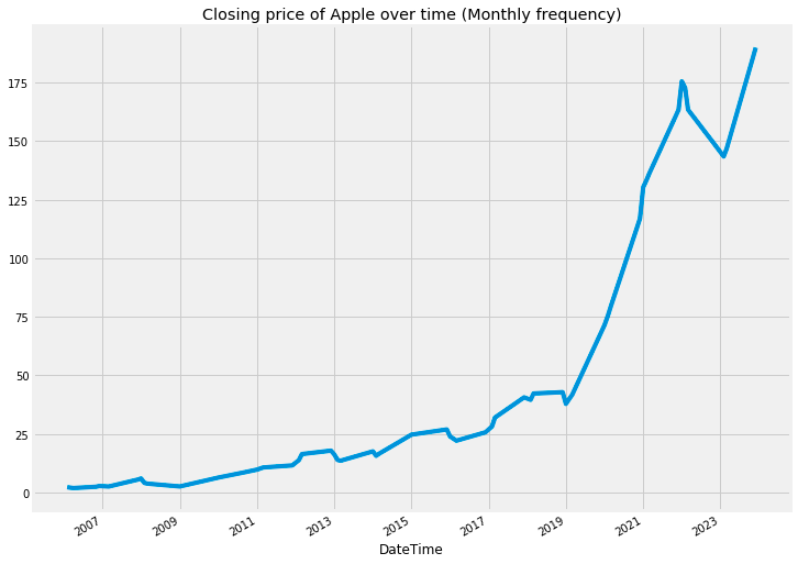 plt.title('Closing price of Apple over time (Monthly frequency)')
