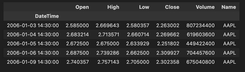 A notable feature incorporated into the DataFrame is the addition of a new column named Name, which explicitly identifies the data as pertaining to AAPL, regardless of the original data source.