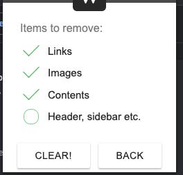 Then, everything will be selected, except for images, links, and sidebars, which I do not wish to select. I would like to remove the following items: Links, Images, Tables, and Sidebars. As a result I can just get the text.