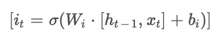 A forget gate makes a decision about what should be kept or deleted from a cell's memory by taking into account the old hidden state and the current input. Mathematically, it is:- The input gate and candidate cell state decide what new information should be added. The input gate is calculated similarly to the forget gate: