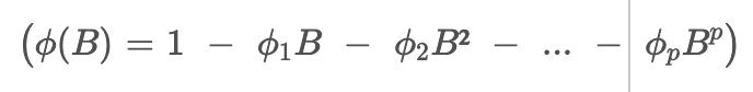 , where (Xt) is the observed value of the time series at time(t) and (Bi) is the lag operator that shifts the time series back by (i) time units, the AR operator of order (p) for an AR(p) process is given by the equation