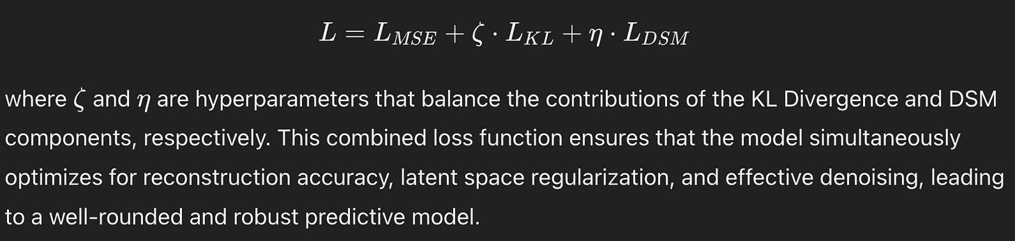 Hyperparameter tuning is a critical aspect of the optimization process. The trade-off parameters ζ\zetaζ and η\etaη are selected through grid search, systematically exploring a range of values to identify the optimal balance between KL Divergence and DSM losses. This tuning ensures that the model effectively regularizes the latent space while maintaining high denoising performance, ultimately leading to superior prediction accuracy and reliability.
