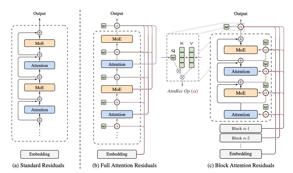 > The residual becomes a weighted, normalized read from past layers.