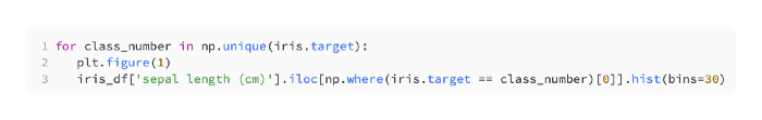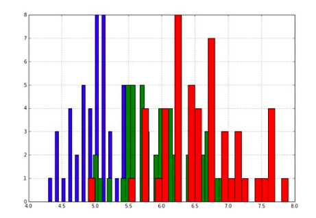 Histograms overlap, as can be seen in the figure below. The three histograms can therefore be modeled as three normal distributions. In machine learning, we can accomplish this if we model the training data as three normal distributions instead of the entire set. We then test the three normal distribution models we just created on the test set. The final step is to test whether our predictions were accurate on the test set.