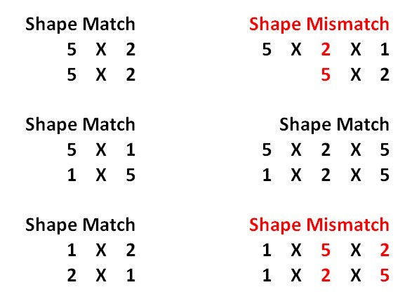 In formal broadcasting, all the numbers must either match or be one when comparing right to left the shapes of both arrays. From right to left, 5 X 2 and 5 X 2 are the same shapes. Despite this, the shape 5 X 2 X 1 does not match 5 X 2, since the second value from the right, 2 and 5, are mismatched:
