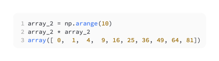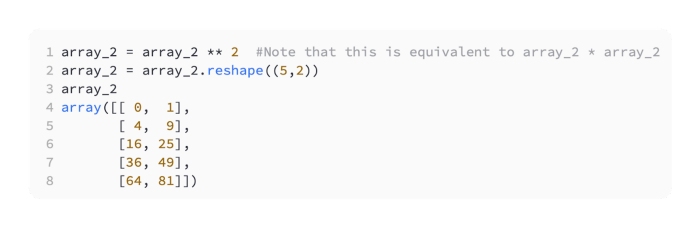 Create a new array called array_2. The following results occur when you multiply an array by itself (this isn’t matrix multiplication; it’s array-wise multiplication):