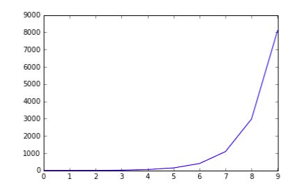 plt.plot(np.arange(10), np.exp(np.arange(10)))