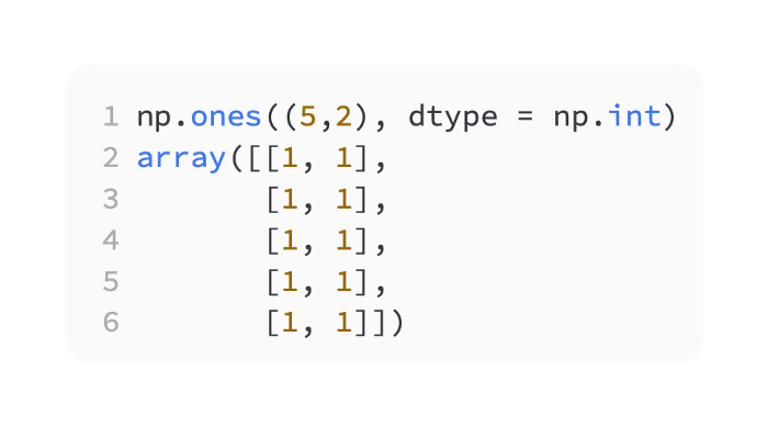 A one-based array is created with np.ones. Make sure the ones are NumPy integer types by setting the dtype argument to np.int. It is important to note that scikit-learn expects np.float arguments in arrays. NumPy array elements are typed by their dtype. Throughout the array, it remains the same. There is an np.int integer type for every element in the array below.