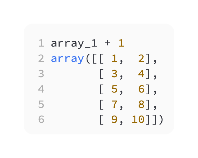 Broadcasting refers to stretching or broadcasting the smaller array across the larger array. This example adds the scalar 1 to array_1 after stretching it to a 5x2 shape.