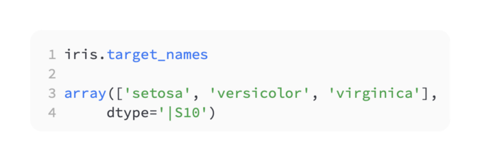 The output of the iris.target_names variable lists the English names for the numbers in iris.target. A setosa flower is number zero, a versicolor flower is number one, and a virginica flower is number two. Iris.target shows the following first row: