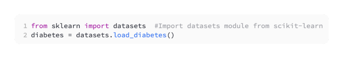 That’s it! A datasets module function load_diabetes() was used to load diabetes. The datasets available can be checked by typing: