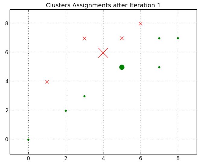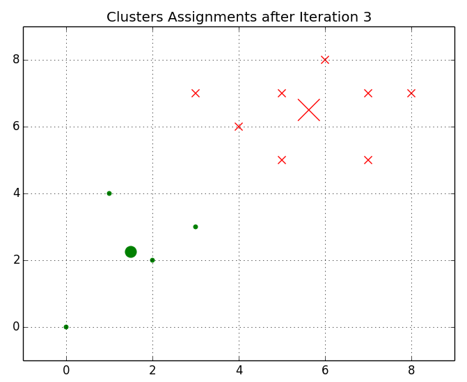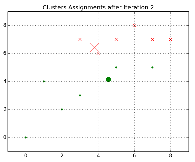 Based on the second iteration of the algorithm, the following plot shows the centroids and cluster assignments: