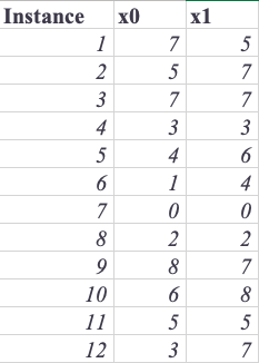Two explanatory variables are used, each with one feature extracted. The following figure shows the instances: