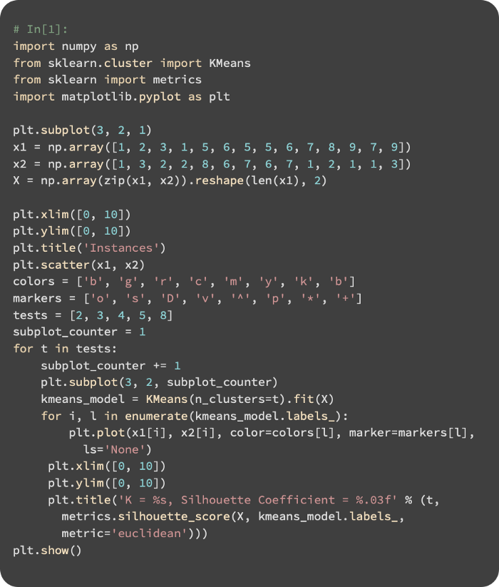 A machine learning system learns from experience and improves its performance as measured by some metric through experimentation. K-means is an unsupervised learning algorithm that does not require labels or ground truth for comparison. Nevertheless, intrinsic measures can be used to evaluate the algorithm’s performance. The distortions of clusters have already been discussed. The silhouette coefficient is another measure of clustering performance. An indicator of compactness and separation between clusters is the silhouette coefficient. Increasing quality yields larger clusters; small, overlapping clusters yield small clusters; compact clusters yield large clusters. In a set of instances, the silhouette coefficient is calculated by averaging the scores of the individual samples. This equation calculates the silhouette coefficient for an instance:
