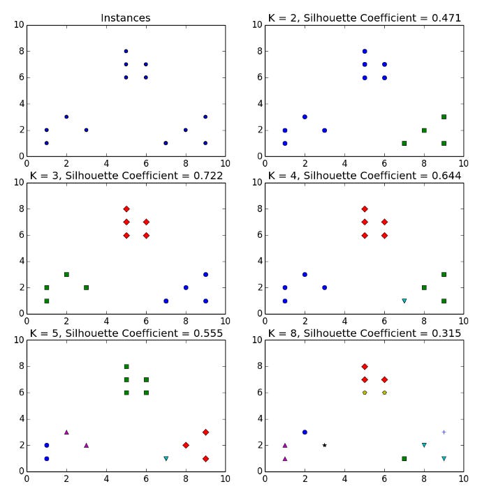 Three obvious clusters can be seen in the dataset. In this case, K equals 3 gives the greatest silhouette coefficient. With K = 8, clusters of instances share the same closeness as clusters in some of the other clusters, and their silhouette coefficient is the smallest.
