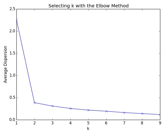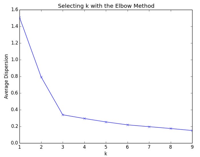 Here is a plot of the elbows for the dataset. Adding a fourth cluster results in the greatest decline in the rate of improvement to the average distortion. Therefore, k should be set to 3 for this dataset based on the elbow method.