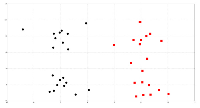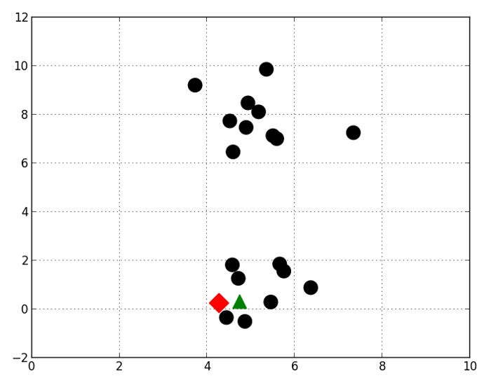 The centroids of K-means are usually initialized to random positions. In some cases, this random initialization leads to K-means converge to a local optimum because the centroids are set in unlucky positions. The following positions are assumed for two cluster centroids by K-means: