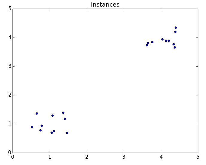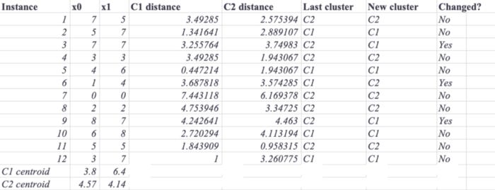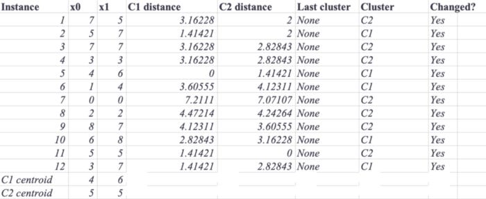 If K-means initializes the centroid to the fifth instance for the first cluster, and to the eleventh instance for the second cluster, the results will be as follows. Each instance will be assigned to the cluster with the closest centroid based on its distance from both centroids. In the following table, the Cluster column shows the initial assignments: