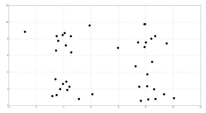 The elbow method can be used to estimate the optimal number of clusters if k is not specified by the context of the problem. In the elbow method, the cost function is plotted based on the values of k. For each cluster, the average distortion decreases as k increases, and the instances are closer to their centroids as k increases. Increasing k, however, will result in a declining improvement in average dispersion. It is called the elbow when the improvement to dispersion declines most at a given value of k. In this example, we will use the elbow method to determine how many clusters to create. Based on the scatter plot below, we can see that there are two obvious clusters in the data: